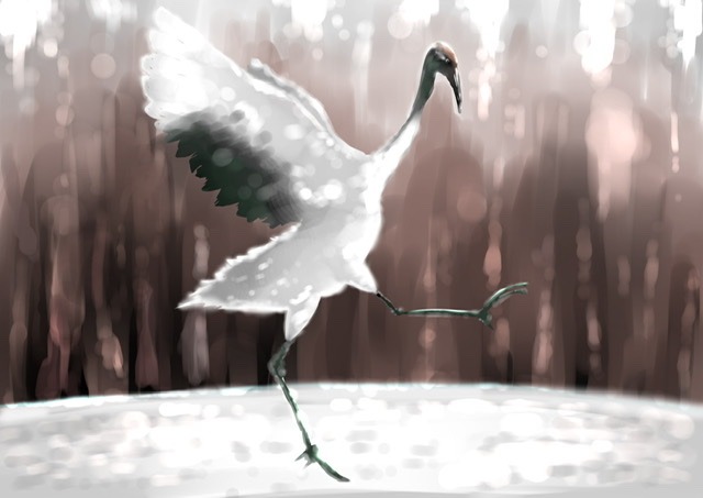 鶴の躍動感を雪に反射する陽光と共に表現。