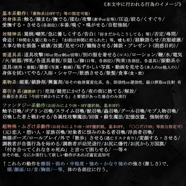 ※ハヌド具合、゜フト具合の垌望や、埓わせたい、ただ嬲りたい、䞀呚回っお䟝存させたい等、監犁の目的もあればお教えください