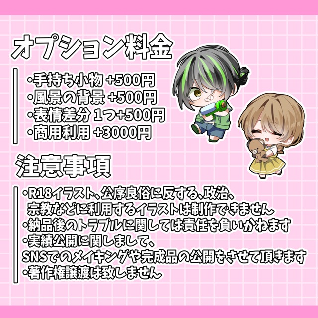 TRPGの立ち絵を依頼させていただきました。通常・戦闘の二種類で、どちらも最高でした!生き生きとしたポージングで描いてくださり、また、修正していただきたい箇所にも丁寧に早い対応をしてくださりました。また機会がありましたら是非よろしくお願いいたします。