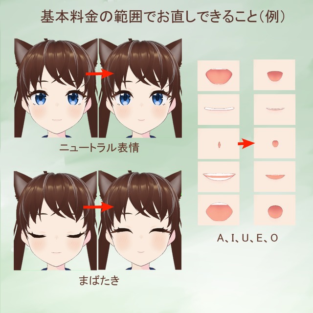 ニュートラル表情(目と口)、まばたき表情(目と口)、A/I/U/E/O(口)