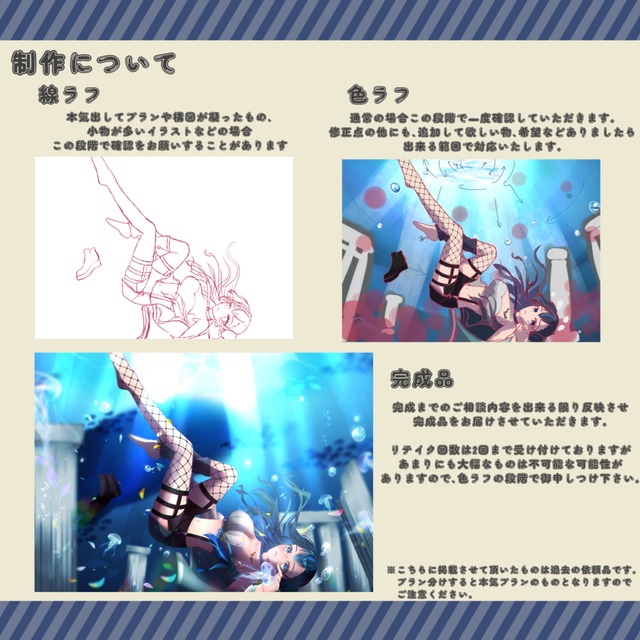 実績非公開やポートフォリオ不可、商用利用をご希望の場合は料金に変動があります。事前にお知らせください。