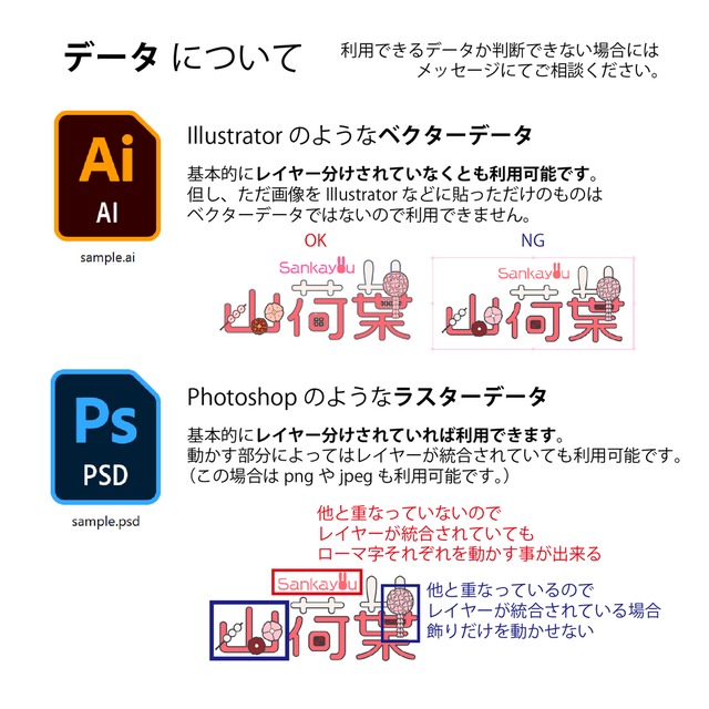 ・作成したものは実績、ポートフォリオ、SNSに掲載させて頂く場合がございます。NGの場合には事前にお伝え下さい。