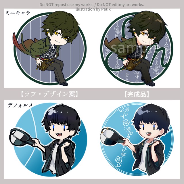 自分を元にデザインしたSNSアイコンが欲しかったけれど中々デフォルメやミニキャラかつ自画像写真を元にといったことが可能な方は少なくダメ元でしたが、「写真を元にミニキャラ出力したデザイン」とインターネットから引っ張ってきた服装参考スクリーンショット(ロゴ等はそのままは権利上不可の為、元の形を損なわない程度にデザインを変えた形に変更)」で今回は描いて頂けました。また機会があれば是非お願いいたします!
