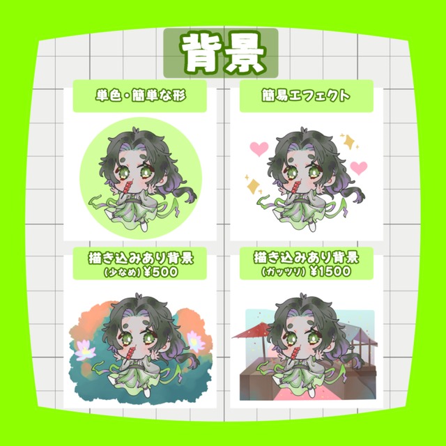 ■背景 (単色,簡易エフェクト_無料 / 背景[描き込み少なめ]_+500円 / 全面背景_+1500円)