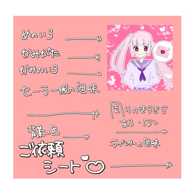 目の色、髪型、髪色、セーラー服の色味、ラブレターの色味が指定できます。