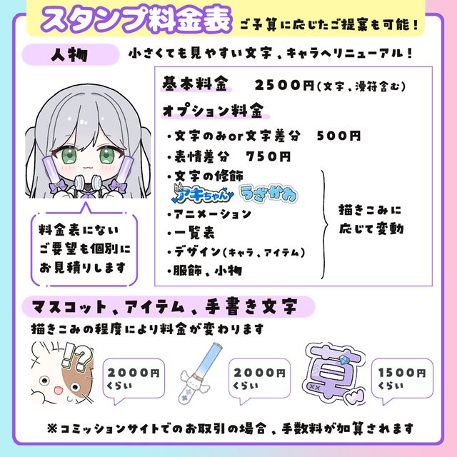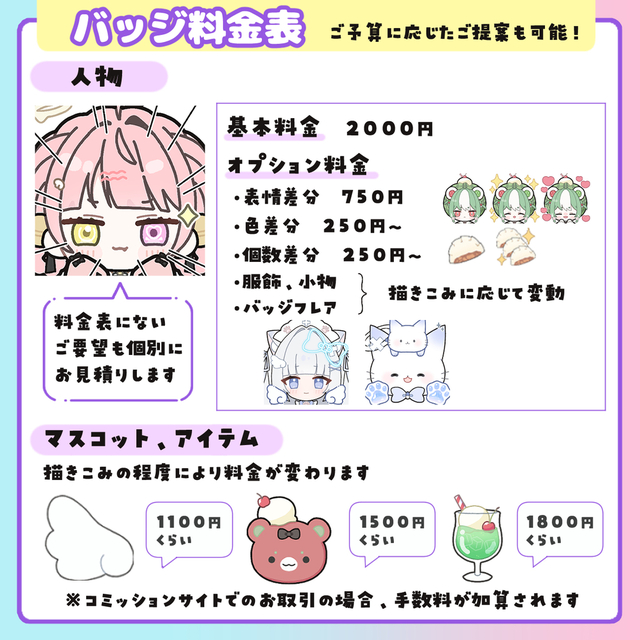 キャラが複数だったり、装飾が多い場合、料金が変動します