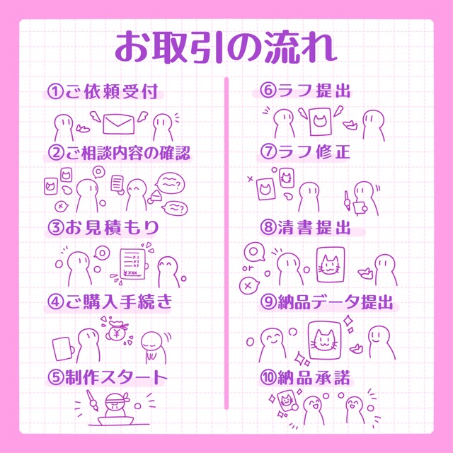 ・ご依頼時に、ラフ提出可能日および納品可能日をメッセージにてお伝えします。