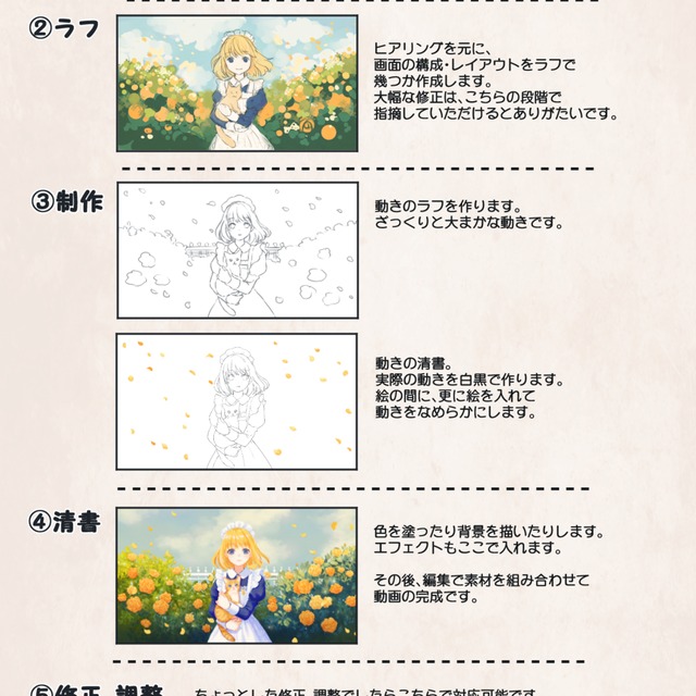 ※修正は、「ラフの提出」段階でご教示ください。ポーズや服装、装飾など大幅な変更はラフ完成後はお受けできません。