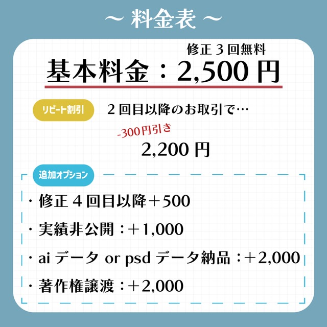 ・制作物は実績として、サンプルやポートフォリオで公開する場合があります。非公開にしたい場合は+1000円のオプションをご利用下さい。