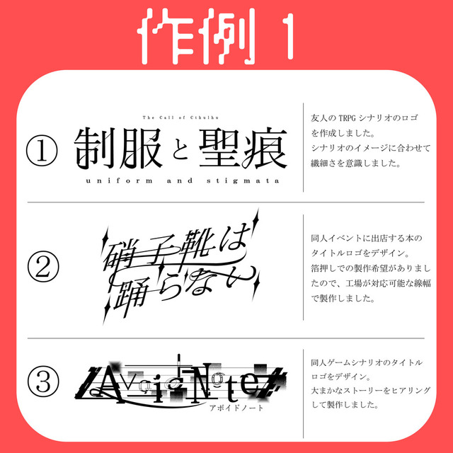 TRPGのロゴデザインをメインに動画、ゲーム、同人誌等、様々な用途でご使用いただけるロゴを制作いたします。