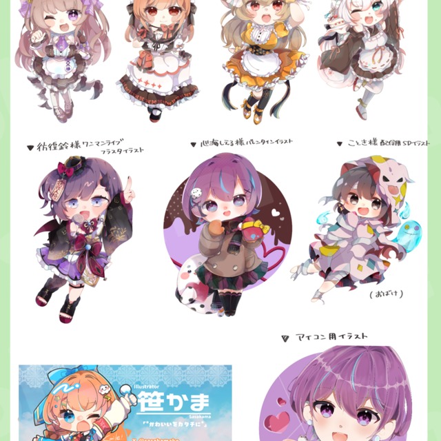 ミニキャラでは作風として線画有りと無しの2種類がごさいますので、お手数ですがギャラリーやポートフォリオにて確認頂けたら幸いです+*