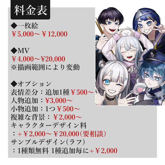 キャラクターデザイン料:+¥2,000〜¥20,000(要相談)