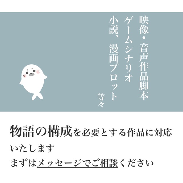 映像作品📹・シチュエーションボイスなどの音声作品🎙️・ゲーム作品🎮・小説📗など、「物語の構成を必要とする作品」について、ご希望どおりの脚本・台本・プロット・シナリオを執筆いたします。