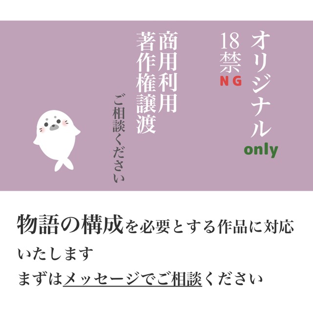 この出品物により製作された作品の著作権はすべて、私、しろあざらしのものになりますことをご了承ください。