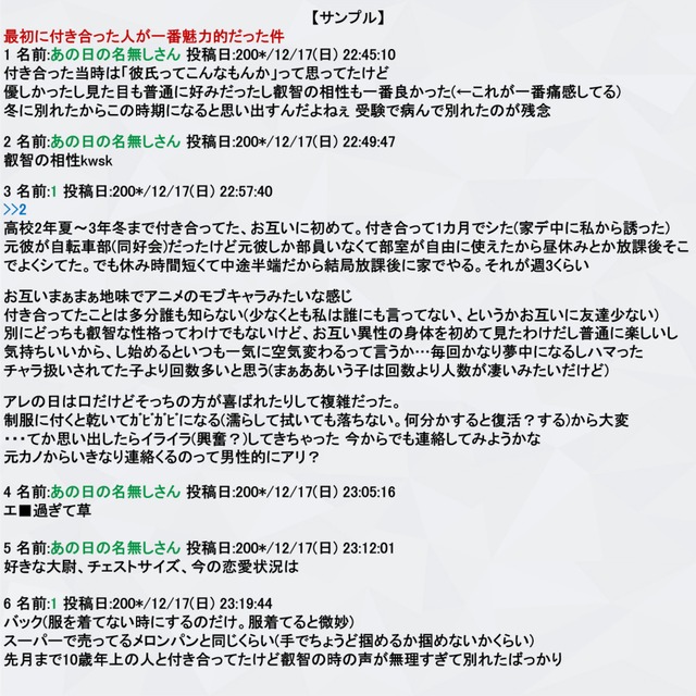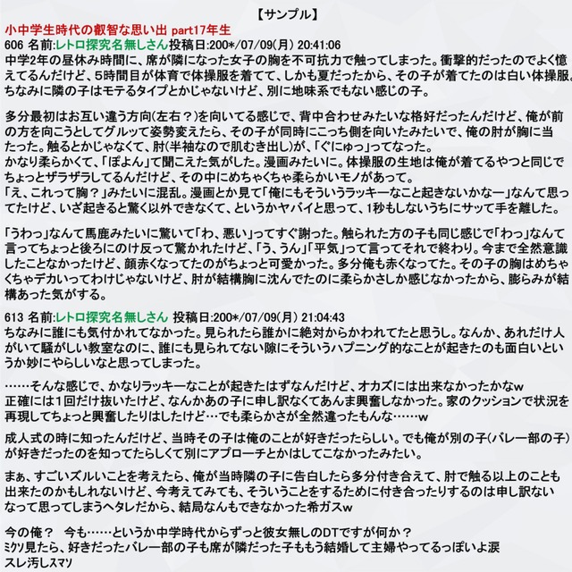 昔のネット掲示板に投稿されていた個人の体験を連ねた書き込みが、官能小説やらよりむしろ興奮できた、楽しかったように感じるので、あの雰囲気を再現し楽しんで頂ければと思います。