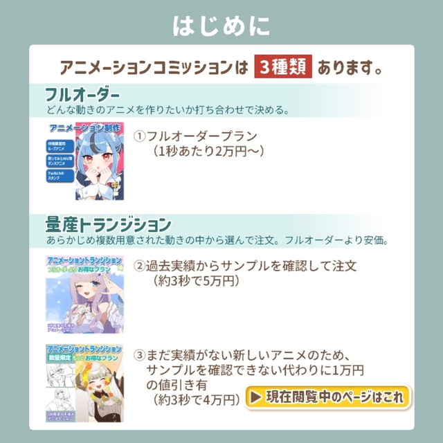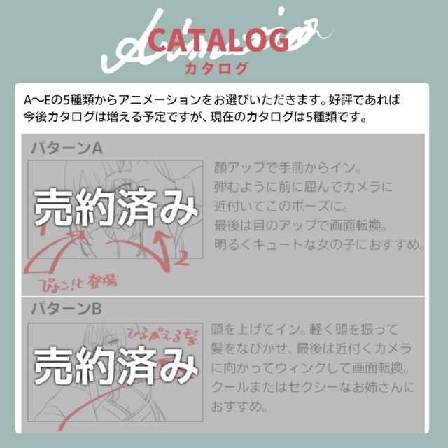 このコミッションは、こちらであらかじめ用意した動きの中から選んで依頼する形式にすることで、フルオーダーのアニメよりもお得なプランです。