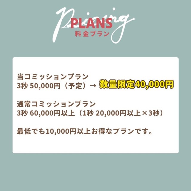 ・カタログサンプルに載せる実績作りのため、当コミッション(今回の値引き)のみ割引料金に設定しています。今後もカタログを増やした時に新しいアニメに対して同様の値引きを行う可能性があります。