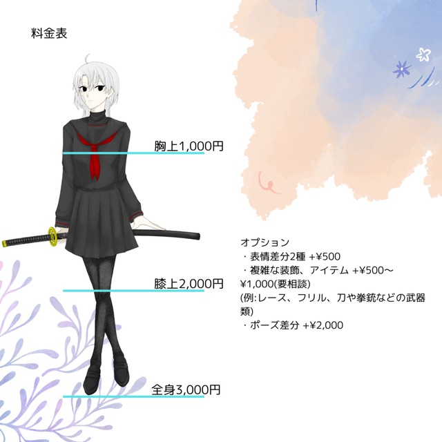 ・納品した立ち絵は、SNSなどに実績、サンプルとして掲載させていただく場合がございます。辞めて欲しい等ご希望ございましたらその旨お伝え下さいませ。