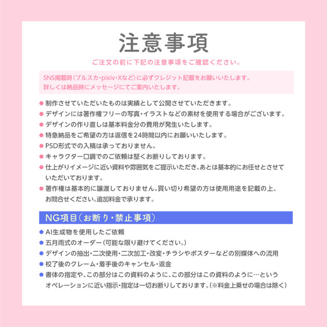 ※著作権は譲渡しておりませんので、納品デザインをグッズや商用利用する場合は別途料金を上乗せの上お問い合わせください。