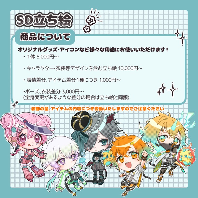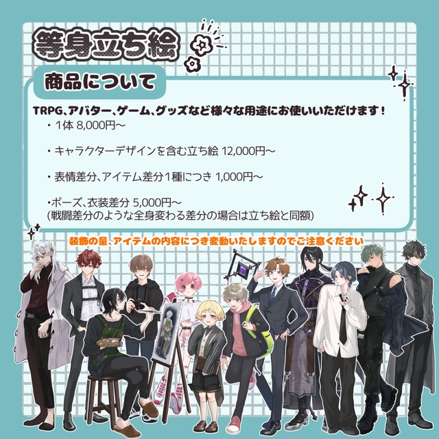 ご依頼キャラクターの内容によって変動いたしますので、あらかじめご了承ください。
