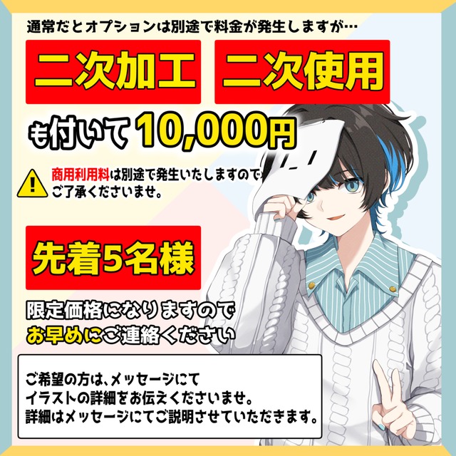 • 【先着5名様限定】立ち絵・1枚絵などなんでも一律1万円で承ります!