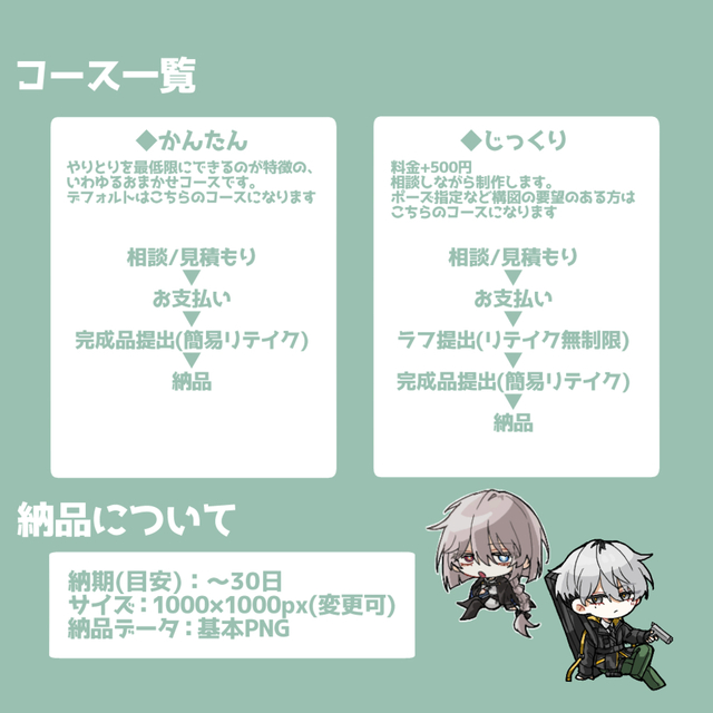 また、構図や頭身等を指定することは出来ないが安価でSD制作承る窓口もございますので、そちらも併せてご確認いただければ幸いです