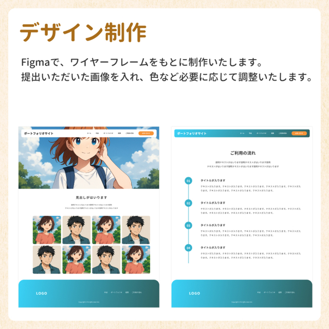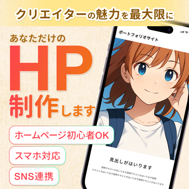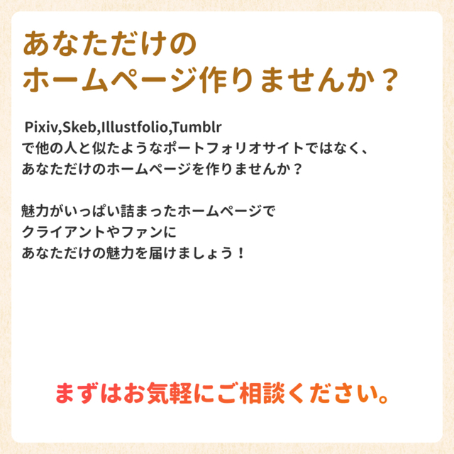 ホームページの作成、デザインいたします。 ホームページの構成、予算など分からない(困っている)部分があれば、是非一度ご相談ください。 ─・─・─・─・自己紹介 ─・─・─・─・ Krezon(クレゾン)の ちか と申します。 以前、描いていただいた絵師さんのイラストにとても感動しました。 一生懸命活動されているクリエイターさんの更なる発展をサポートしたく、こちらのスキマにて出品させていただきたいと思います。 よろしくお願いいたします。 ─・─・─・─・─・─・─・─・─・─・ 稼働時間:平日9:00~17:00 (連絡は土日祝可能です) それ以外の時間帯は返信等が遅くなる場合がありますのでご了承ください。 お急ぎのご用がある場合は迅速に対応いたします。一度お気軽にご相談ください。 【ご依頼にあたっての注意事項】 ・料金表の価格は基本価格です。ご依頼内容からお見積もりしますので、価格が前後する場合があります。 ・料金表の価格は現時点の参考です。今後、諸事情により変更する場合があります。 ・著作権譲渡 企業様案件:応相談、個人様案件:不可(お見積り時にご連絡頂いた使用用途の範囲を超えてご使用頂く場合はご連絡下さい。) ・制作物をご依頼実績やサンプルとして当方のポートフォリオ、X、その他コミッションサイト等に掲載させていただく場合があります。掲載NGの場合はお見積もり時に必ずご連絡ください。 ・お客様からの素材やヒアリングシートの提出が遅れる場合、納期が前後いたします。 ・デザイン作成開始後のキャンセルはお受けできません。ご依頼者様都合の途中キャンセルの場合、進捗に応じた料金をいただきます。 ・ご依頼内容、リテイク内容詳細化のための質問をさせていただくことがあります。 ・リテイク時の修正内容は、まとめて具体的にお伝えください。 ・当方からのご連絡は2日以内を原則としております。 ・ご依頼者様からのご返信が滞ることで納期が予定より遅くなる場合があります。 ・お客様の方で原稿、文章、画像をご用意いただく際、それらの著作権をご確認ください。トラブルについては責任を負いかねます。