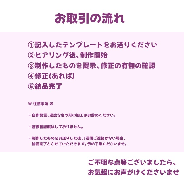 ・制作したものをお送りした後、1週間ご連絡がない場合、納品完了とさせていただきます。予め了承くださいませ。