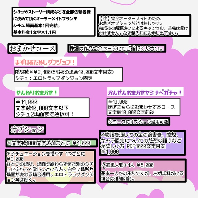 文字数も相応で、何が起こるか分からないのはもちろん、場面も何度か変わるかもしれません。完成するまでわからないソワソワコース。(最後まで楽しみを取っておきたいご依頼主様にはプロットを見せません。プロットの確認をするかはご依頼主様の自由です。その都度お伺いします。)
