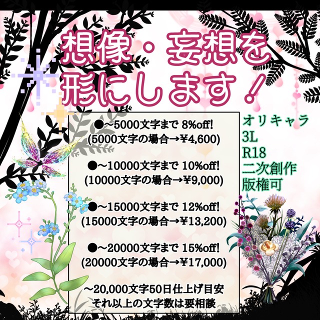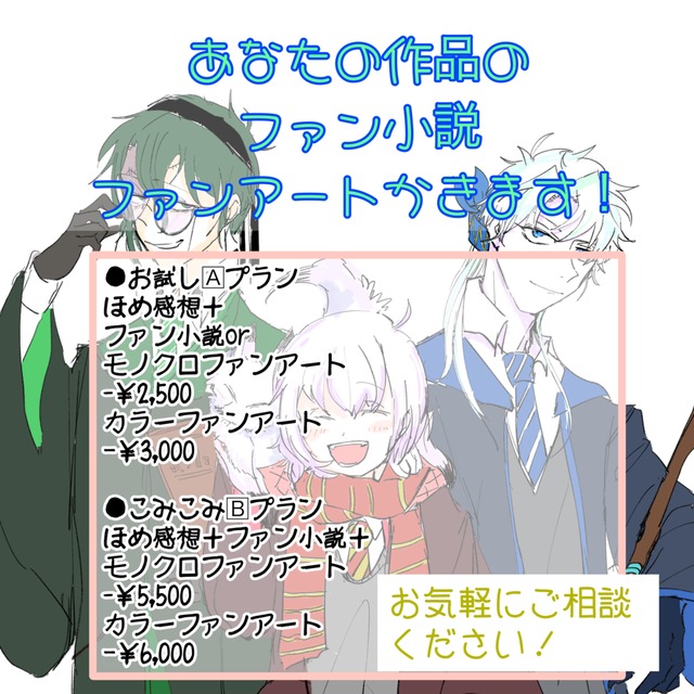 コミッション一つにつき平均20000文字まで承ります。