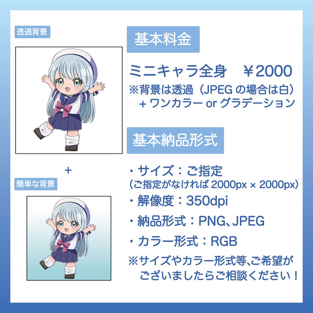 ・イラストを実績としてSNS(InstagramやX等)で掲載する場合がございます。掲載不可の方はご遠慮なくお申し付けください。