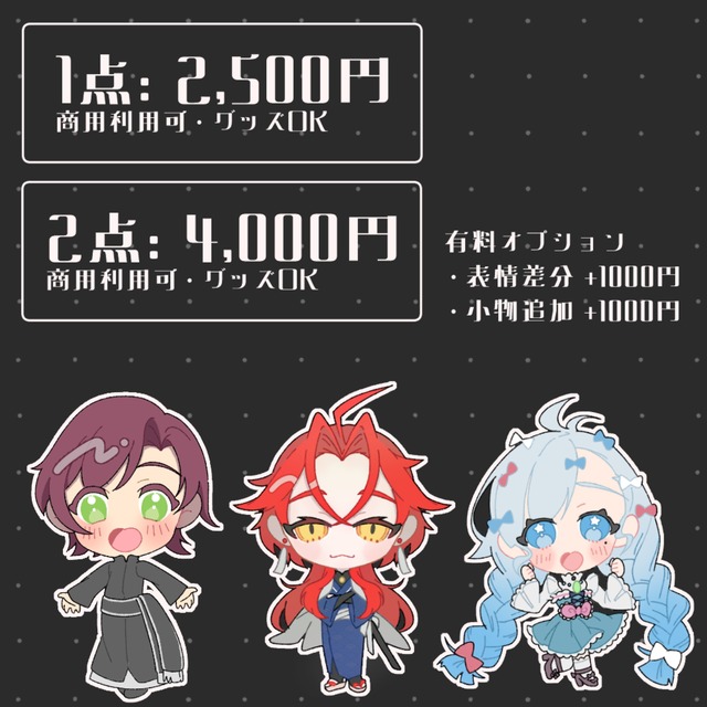 ・表情差分や小物追加、文字入れ、お急ぎ納品などご希望があれば追加料金で承ります。ご依頼内容によって変動しますが、料金目安は画像をご覧ください