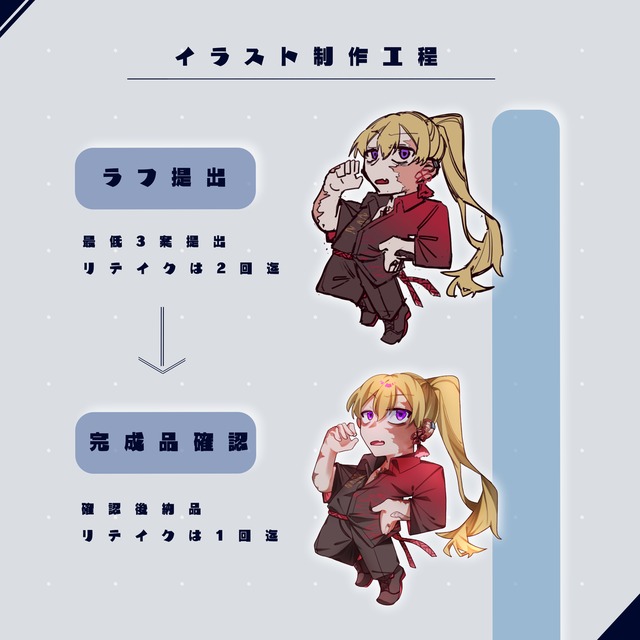 ラフを最低3案提出させていただきます。リテイクは2回まで受け付けています