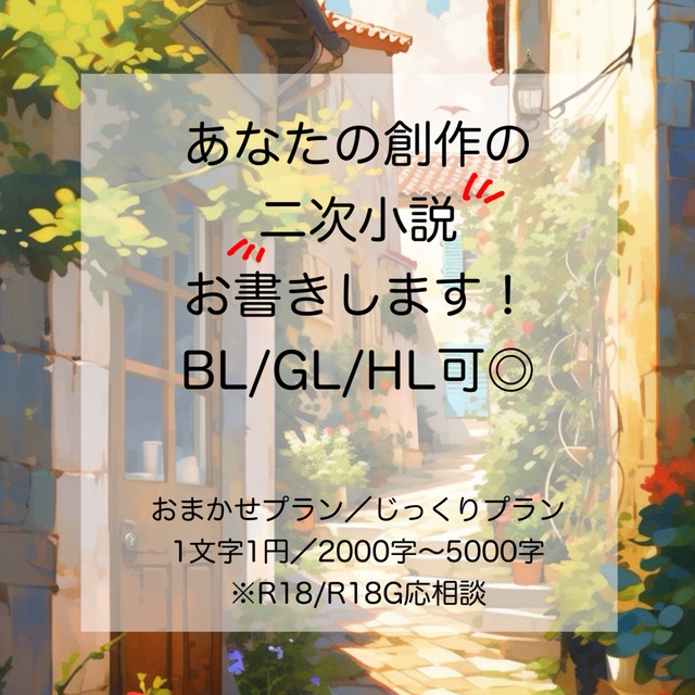 じっくりプランで一次創作オリジナルキャラクターの短編小説をご依頼しました。こちらから沢山要望を出してしまったのですが、とても好みの形に仕上げてくださいました。お願いしたOCの思考も解釈一致でしたし、モブキャラの描写もすごく良かったです。またぜひご依頼させてください!この度はご依頼を受けてくださりありがとうございました!
