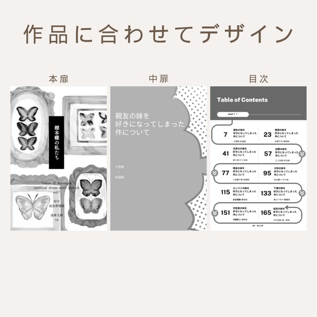 小説同人誌の「本扉」「中扉」「目次」「設定資料」「あとがき」の組版デザインを作成します。