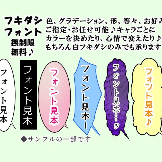 ◆サンプルにあります通りフキダシの色や半透明等、フォントも色等、カスタムを無料で無制限に承ります。
