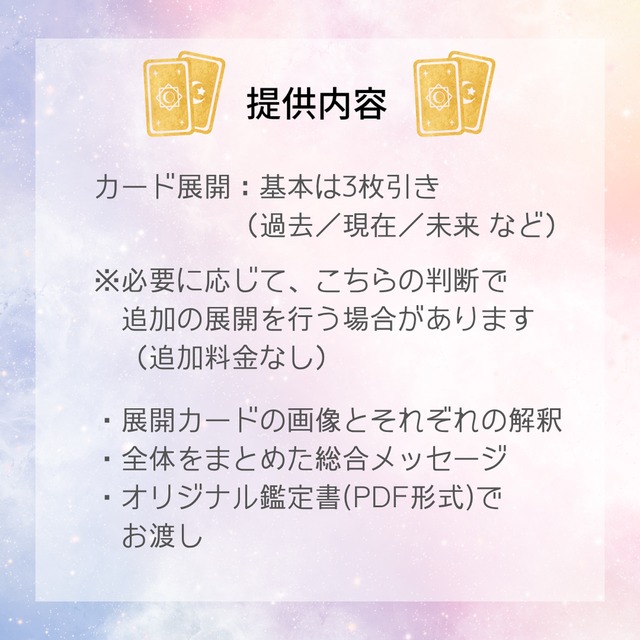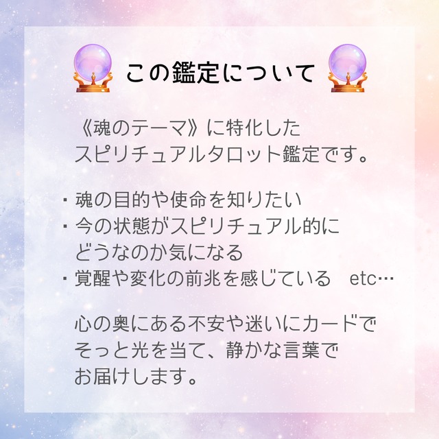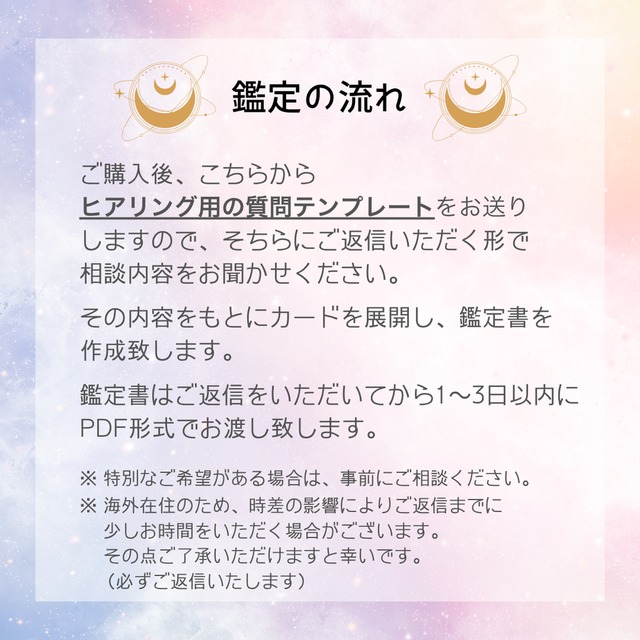 こういった場で占いを依頼するのは初めてだったのですが、真摯に対応していただきました。悩みは込み入っていたのですが、本質の部分をうまく捉えて分解していただけた気がします。鑑定書のレイアウトも綺麗で、ひとつの導きの書という感じですね。また岐路を感じた際に相談させていただければと思います。