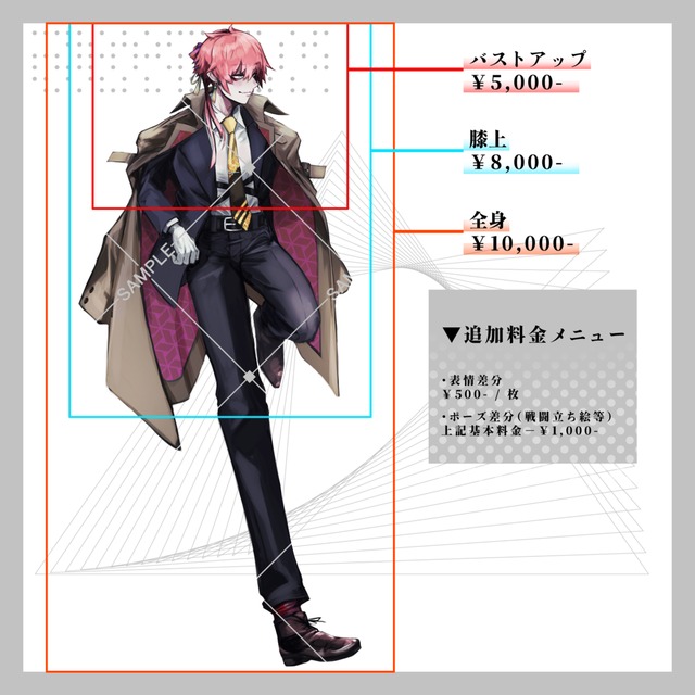 ※ご要望のシチュエーションに沿った表情差分2点まで、眼鏡や上着のオンオフ等の差分を基本料金に含みます。