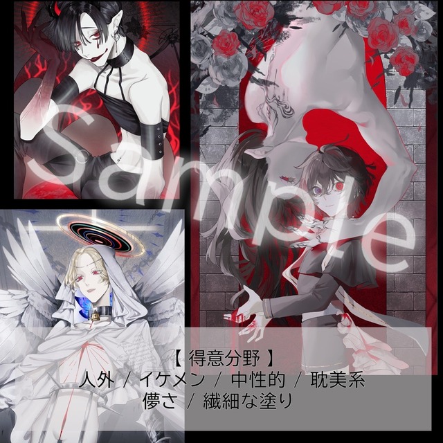 TRPG用の探索者立ち絵を依頼させていただいた者です。幻想的な世界観とダークで妖しく美しい絵柄に惹かれお願いしましたが...迅速なご対応と温かいお言葉だけでなく、お顔立ちや髪型•服などは勿論のこと、衣装の柄や装飾品のデザイン等も細部までしっかり拘って理想像を遥かに超えるとても素敵な立ち絵に仕上げてくださいました。