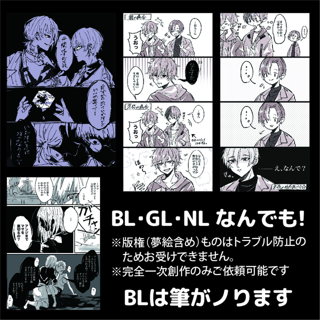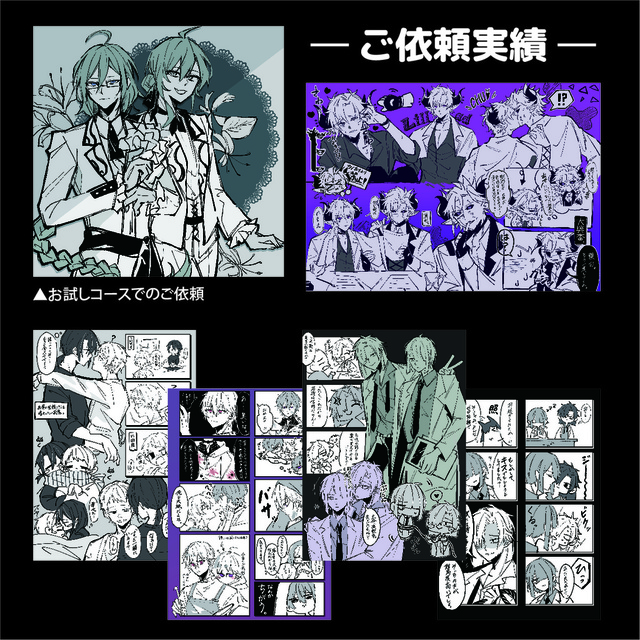 TRPGの自陣イラストをお願いしました。限られた情報の中からキャラの性格や関係性を汲み取っていただき、刺さるイラストや漫画を描いてくださり本当に嬉しいです。いただいたイラストは大切に何度も見返します。またぜひお願いしたいです!