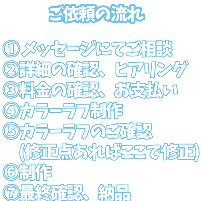 ・修正オプション無しの場合は、カラーラフ確認時に2回、こちらのミス以外での3回目以降の修正は出来かねます。(ポーズを変えて欲しいなど)