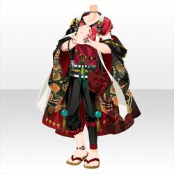 着物:女性物の振袖みたいな豪華な柄の羽織、色は赤。可能であれば赤と黒のグラデーション