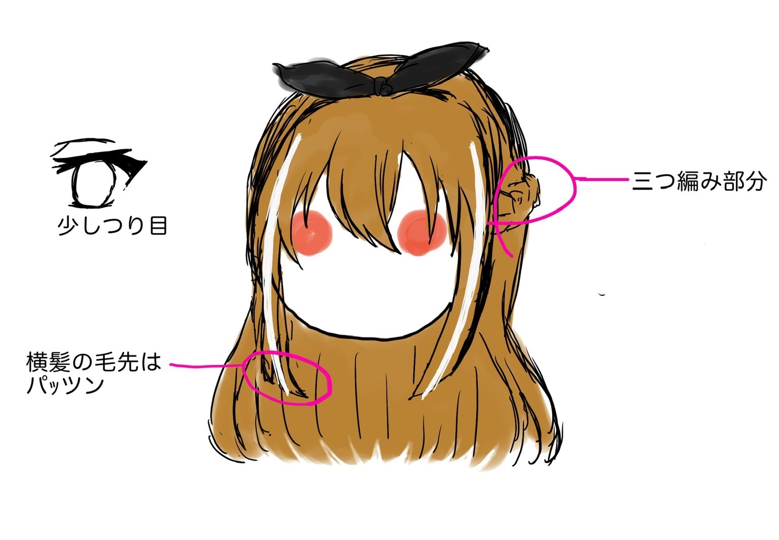 ・髪:セピア色で左右の横髪に白いメッシュ。長さは胸くらいの長さ。頭上に黒いリボンのカチューシャ。髪の一部を三編みにして後ろで止めている。(形や詳細については添付資料をご確認ください)