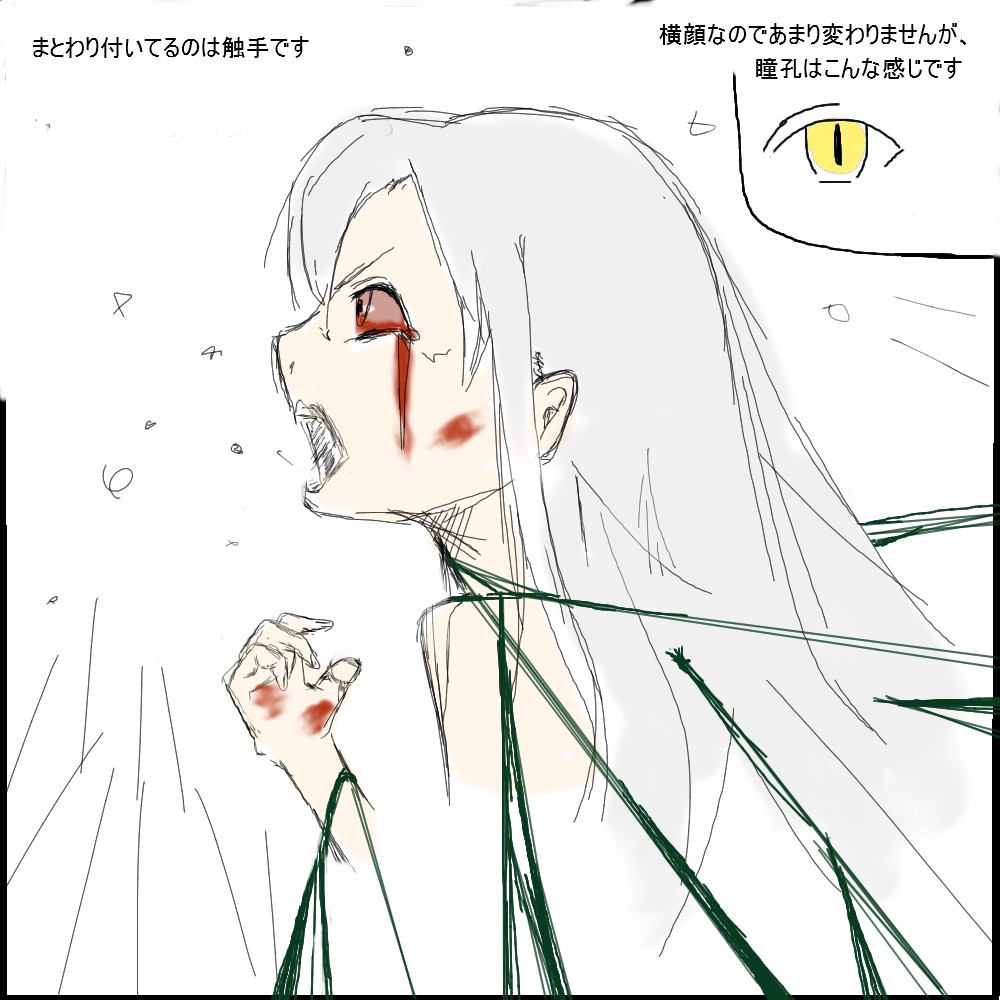 ・中学~高校生くらいの少女(見た目は人間ですが、実は人間ではない)→目の瞳孔の描き方を蛇のように、縦に割ると良いかもしれません(資料参照)