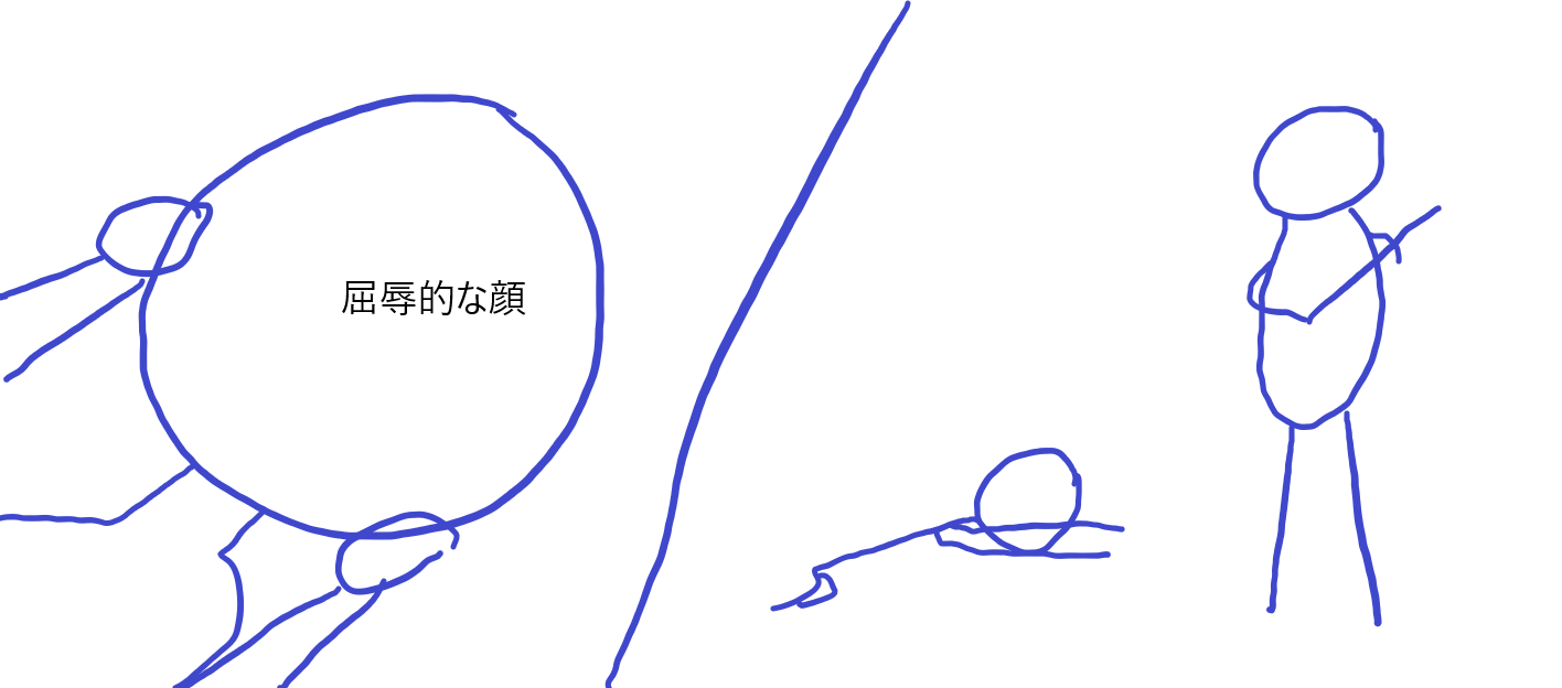 左側は怒りと屈辱が入り混じったような顔をして涙目で耐えているアイシャの表情を地面から見ている構図でお願いいたします。