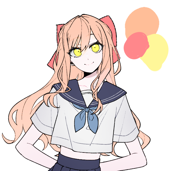 ・髪色や髪型 : ピーチファズ(#ffbe98)色の髪。肩甲骨を過ぎるあたりまであるゆるふわ猫っ毛セミロングヘア。前からでも見える後頭部の大きなリボン(#ff878b)が目印。