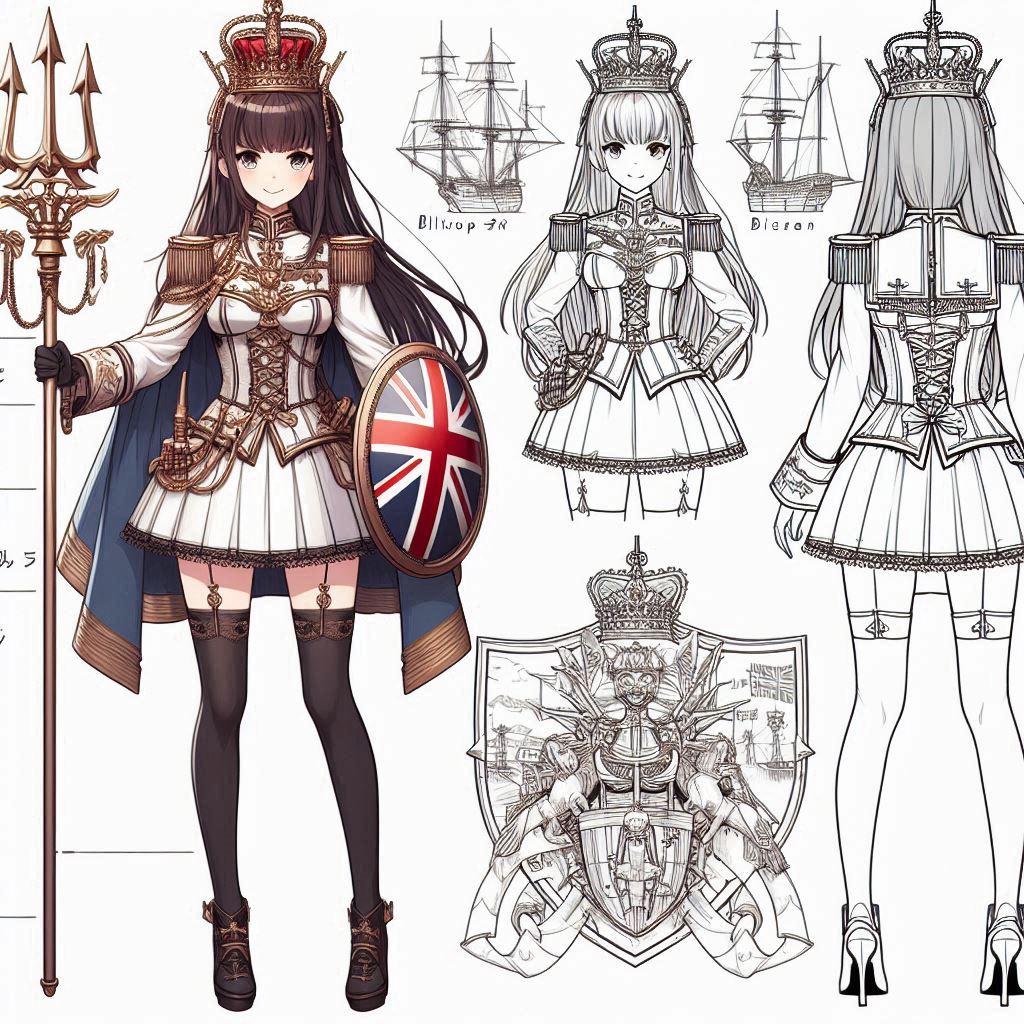 ブリタニア:トライデントと盾を持った王冠を被った女性兵士(海兵と国家象徴の女神ブリタニアのイメージ)