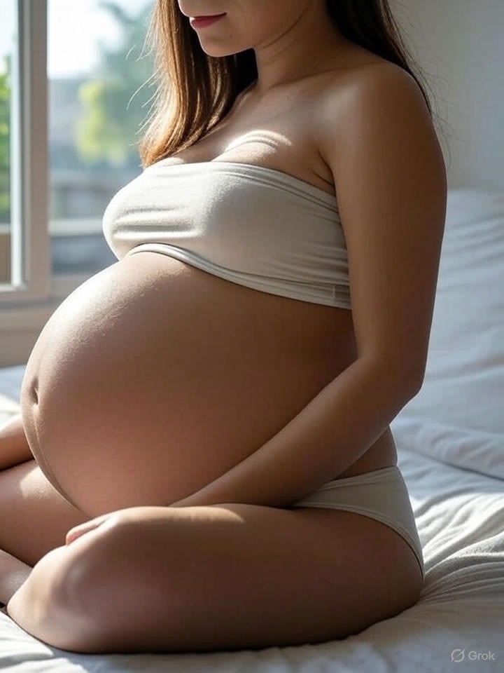・裸のふたなり妊婦が両手に哺乳瓶を持っている