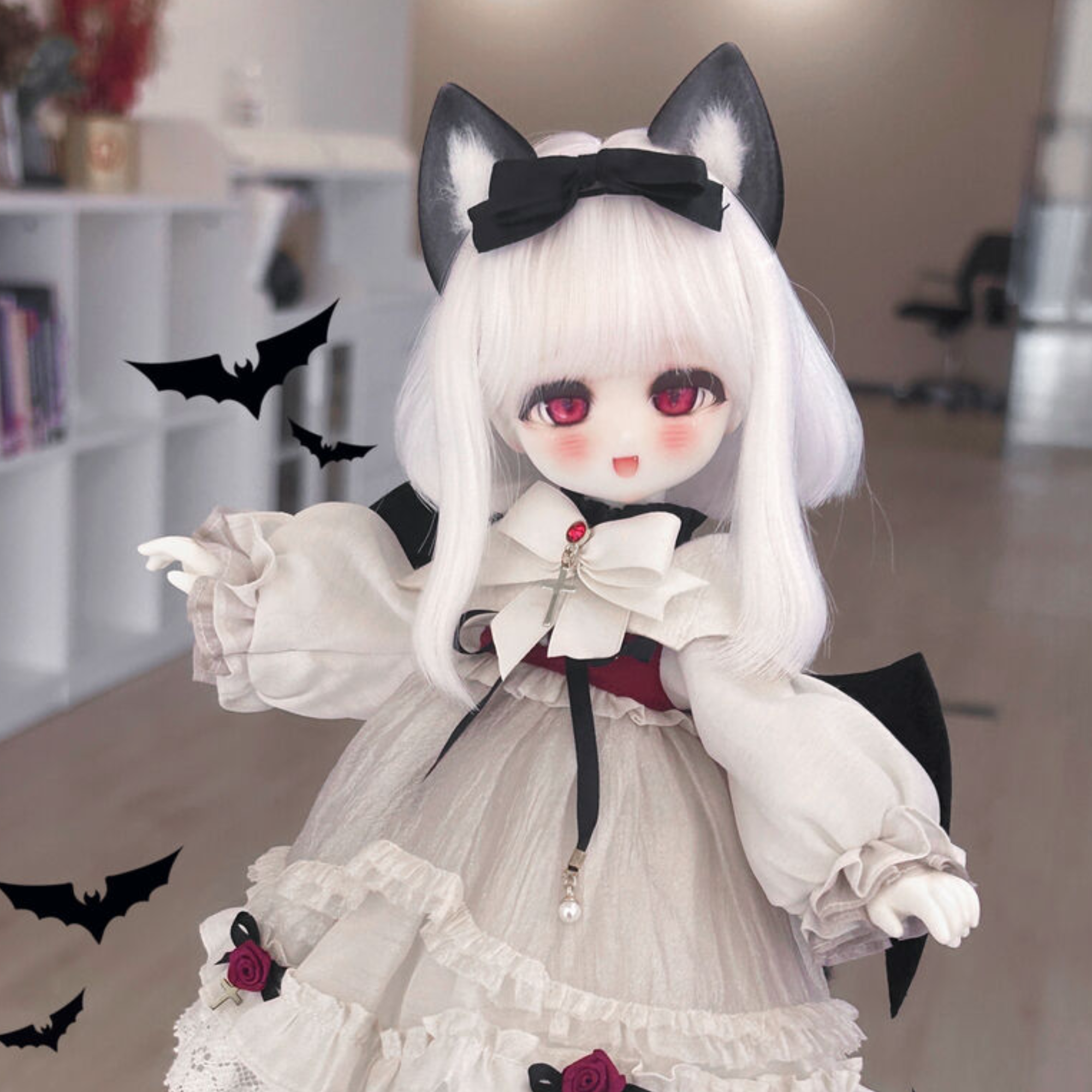 1人目:TinyFoxドールのパラノイドうさぎのメイク(画像1)の子。目の色は左が緑色、右が水色。瞳孔がキャットアイ(縦に細長い感じです)。お顔はThe地雷メイクという感じで笑うと少し目付きが鋭い感じです。