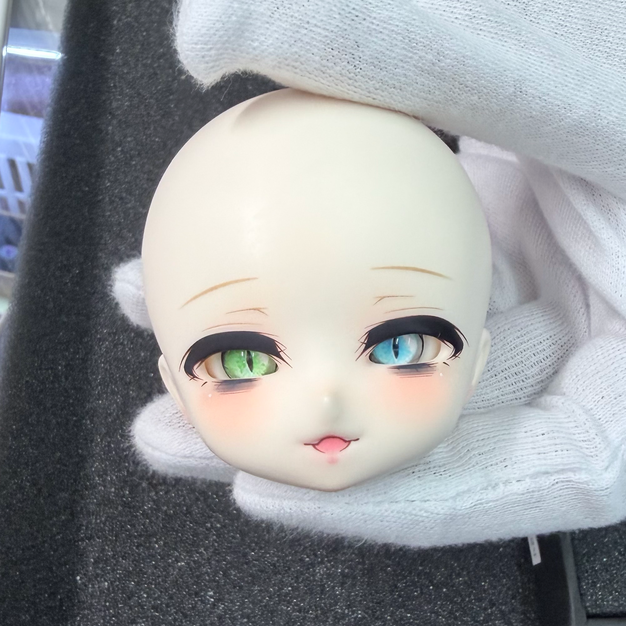2人目:TinyFoxドールのカサンドラのメイク(画像2)の子。目の色は1人目と逆で左が水色、右が緑色。瞳孔も1人目と一緒でキャットアイ(縦に細長い感じです)。こちらの方が笑うとふんわりと柔らかいお顔なイメージです。